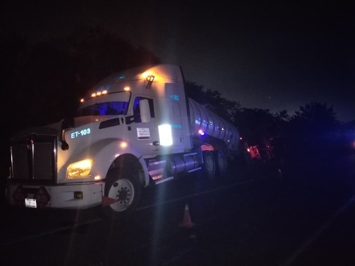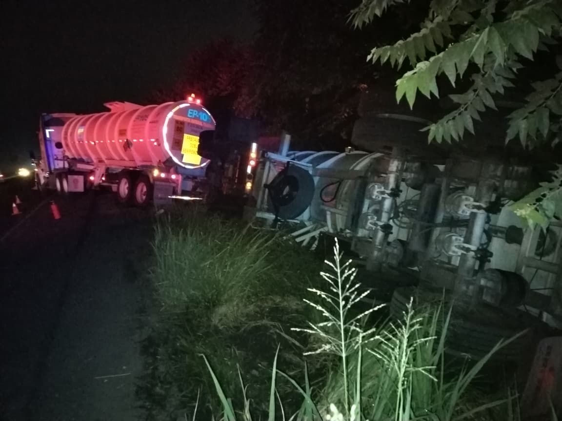La mole de acero se salió de la carpeta asfáltica y el movimiento provocó que el segundo tanque se desprendiera, terminando la unidad volcada sobre su costado derecho, en una escena digna de película policiaca carretera.