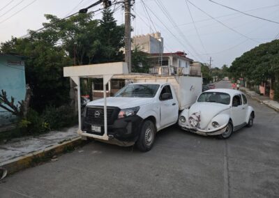Versiones recabadas en el lugar indican que el conductor del vehículo compacto circulaba sobre la calle Sor Juana Inés de la Cruz; sin embargo, al llegar al crucero se encontró de frente con la camioneta de reparto, cuyo operador transitaba por el carril contrario, produciéndose un fuerte impacto frontal que alertó a los vecinos por el estruendo.