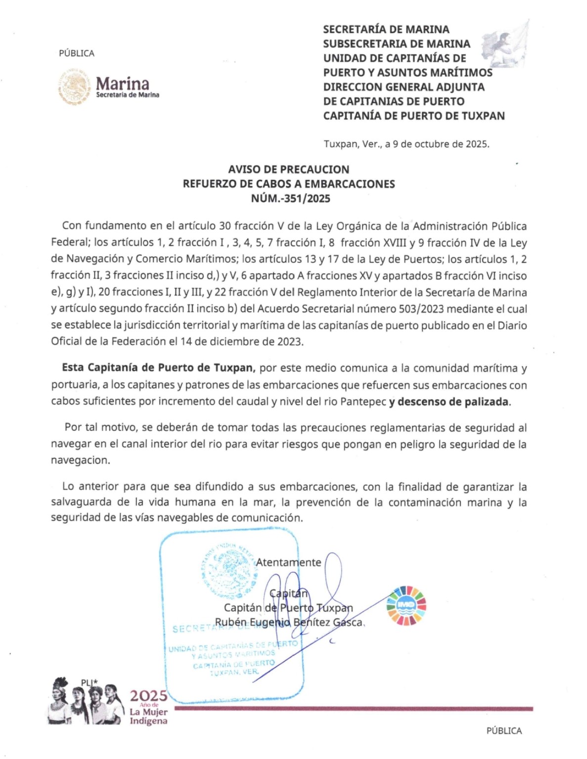 Tuxpan, Veracruz — La Capitanía de Puerto de Tuxpan, dependiente de la Secretaría de Marina, emitió el Aviso de Precaución Núm. 351/2025, dirigido a la comunidad marítima y portuaria, con el objetivo de reforzar las medidas de seguridad en las embarcaciones ante el incremento del caudal del río Tuxpan y el descenso de palizada que podría afectar la navegación.