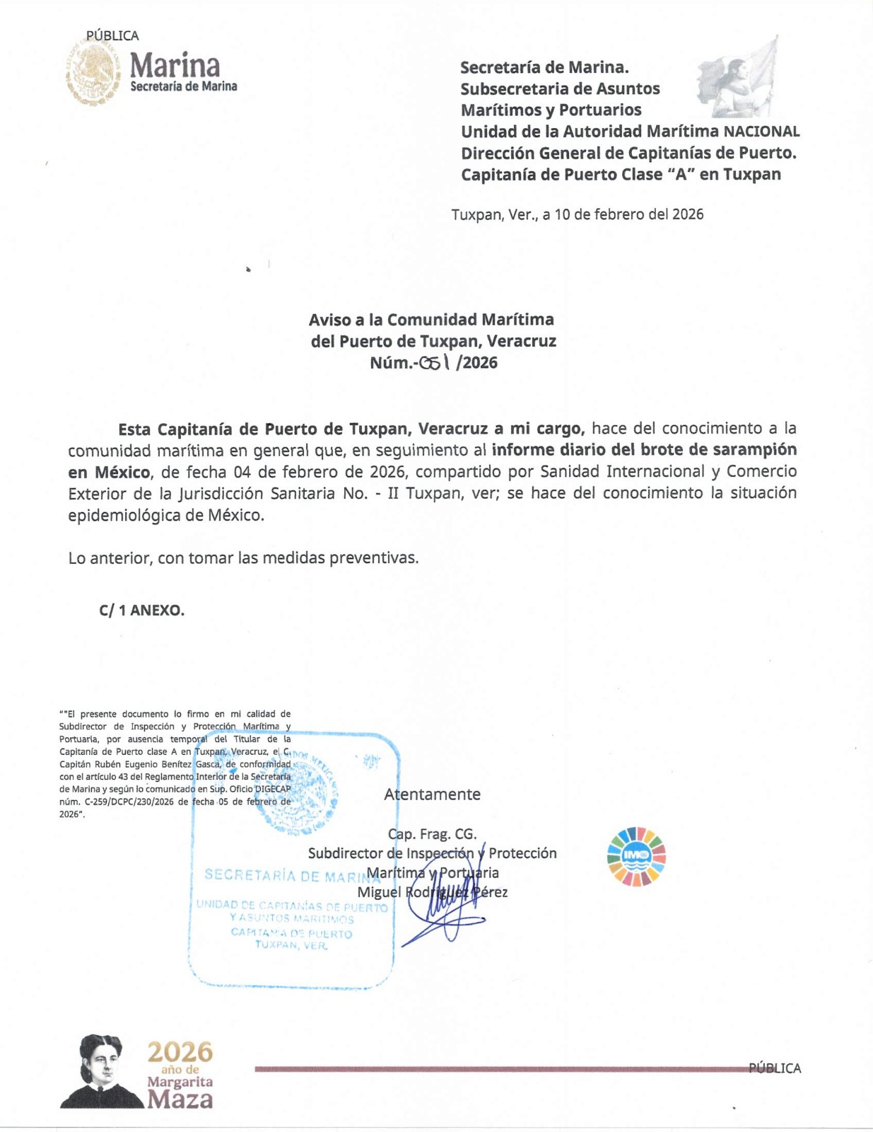 Tuxpan, Veracruz.— La Capitanía de Puerto Clase “A” en Tuxpan, dependiente de la Secretaría de Marina, emitió el Aviso a la Comunidad Marítima Núm. 051/2026, mediante el cual informa sobre la situación epidemiológica nacional derivada del brote de sarampión en México y exhorta a la adopción de medidas preventivas en el ámbito portuario.