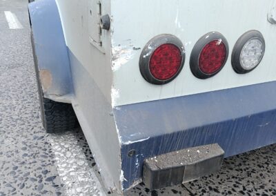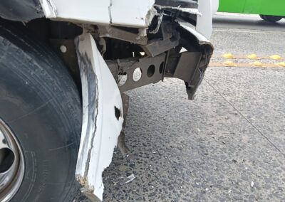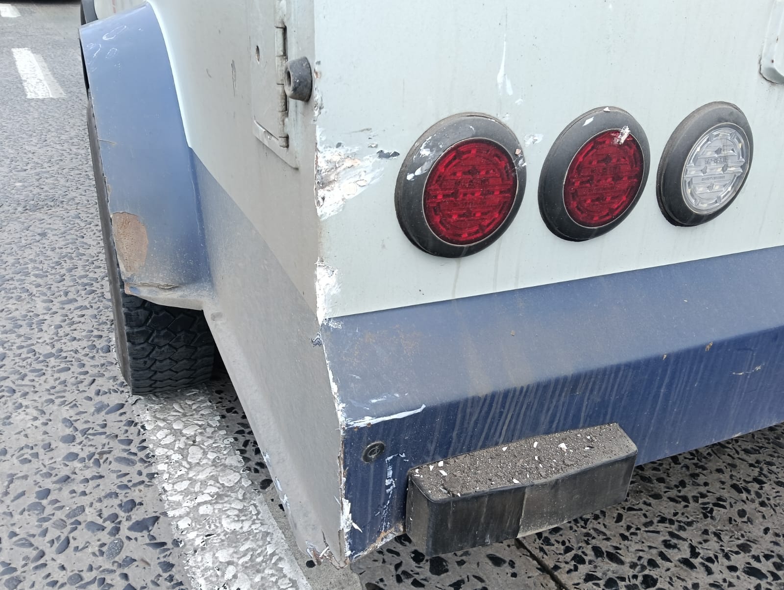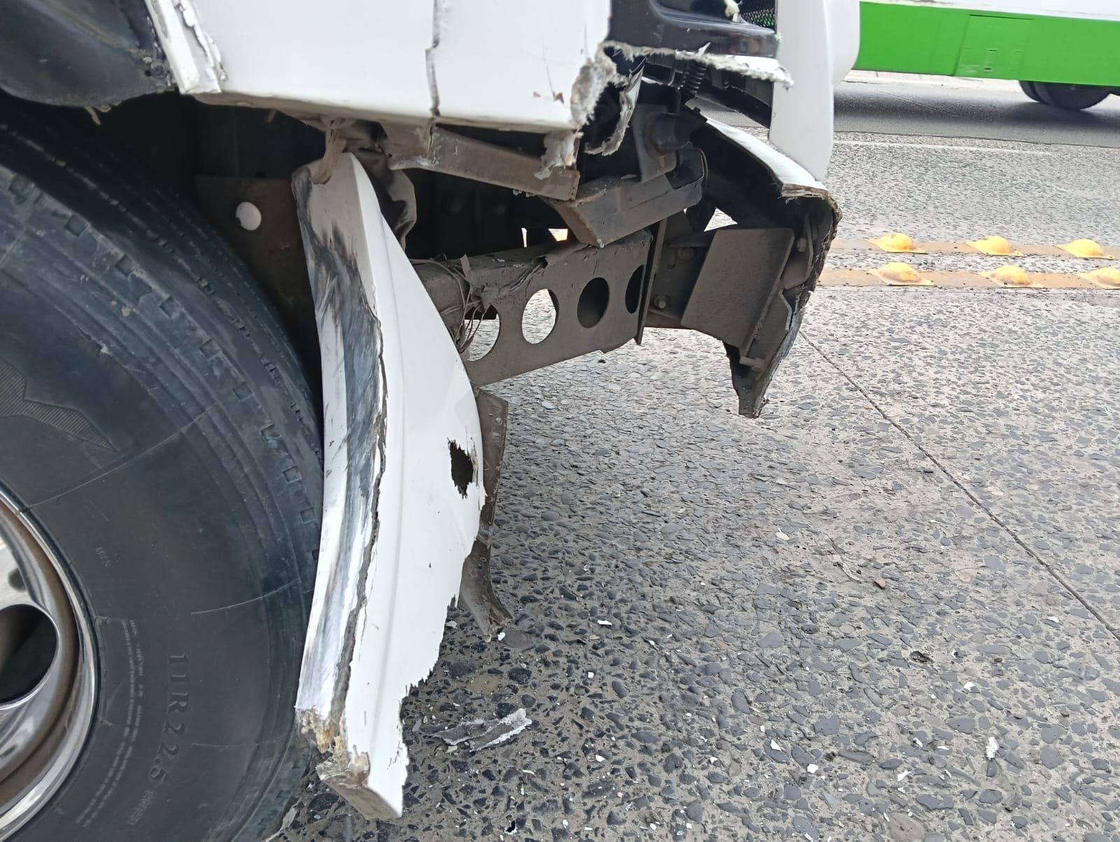 El impacto fue considerable, ya que el autobús perdió parte de la fascia y sufrió daños en los faros del costado donde sube el pasaje, mientras que la pesada unidad blindada apenas presentó ligeros raspones en la parte trasera izquierda.