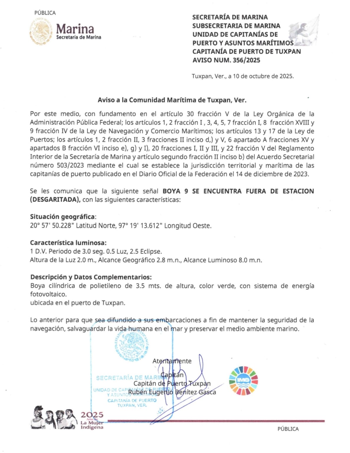La Secretaría de Marina, a través de la Capitanía de Puerto de Tuxpan, emitió una serie de avisos a la comunidad marítima informando que las boyas 5, 6, 9 y 11 se encuentran fuera de estación (desgarradas), lo que representa un riesgo potencial para la navegación segura en el canal de acceso al puerto.
