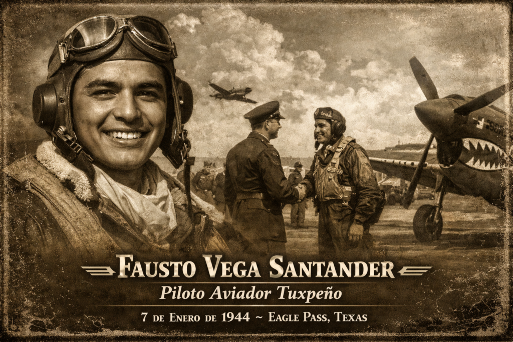 El siete de enero de mil novecientos cuarenta y cuatro, el joven tuxpeño Fausto Vega Santander alcanzó un hito que lo colocaría en la memoria histórica local: se graduó como Piloto Aviador en la base aérea de Eagle Pass, Texas, convirtiéndose en uno de los veracruzanos que más tarde integraría el legendario Escuadrón 201 de la Fuerza Aérea Mexicana, unidad que participó en misiones de combate durante la Segunda Guerra Mundial.