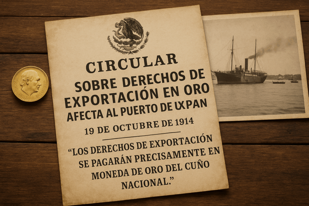 El 19 de octubre de 1914, durante los años turbulentos de la Revolución Mexicana, el gobierno constitucionalista emitió una circular oficial publicada en El Constitucionalista, órgano del régimen carrancista, mediante la cual se establecía que “los derechos de exportación se pagarán precisamente en moneda de oro del cuño nacional”.