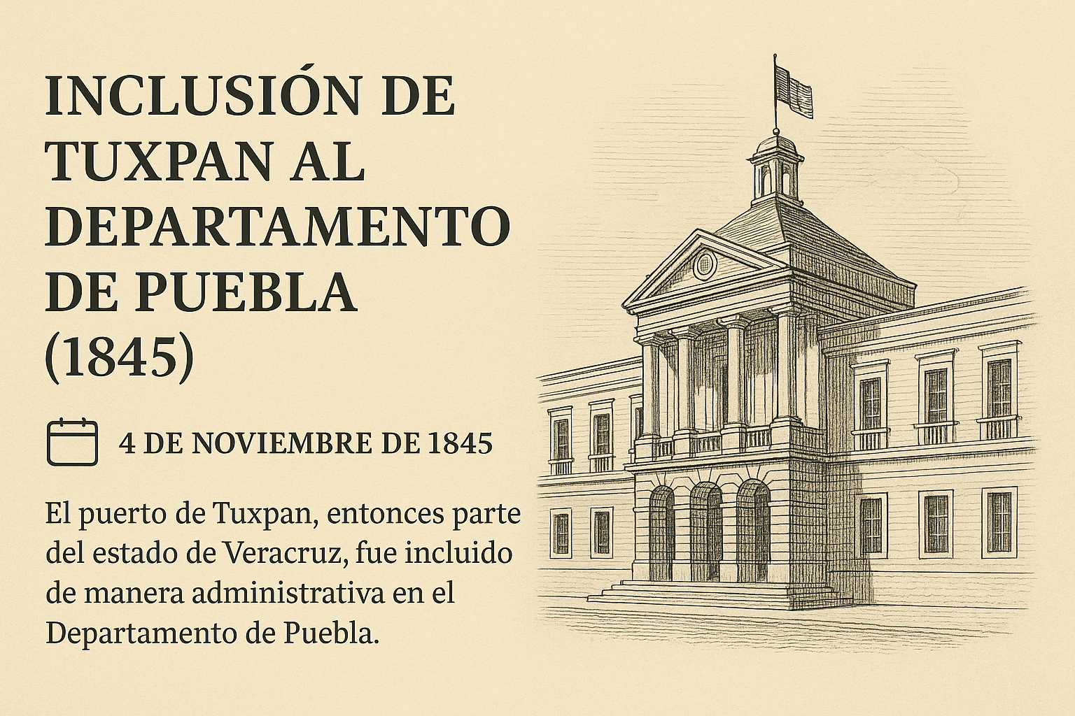 El 4 de noviembre de 1845, el puerto de Tuxpan, entonces parte del estado de Veracruz, fue incluido de manera administrativa en el Departamento de Puebla, en virtud de una reorganización territorial impulsada por el gobierno central de México. Este cambio no representó una pérdida definitiva del territorio veracruzano, sino una medida política temporal en un periodo de fuerte inestabilidad nacional.