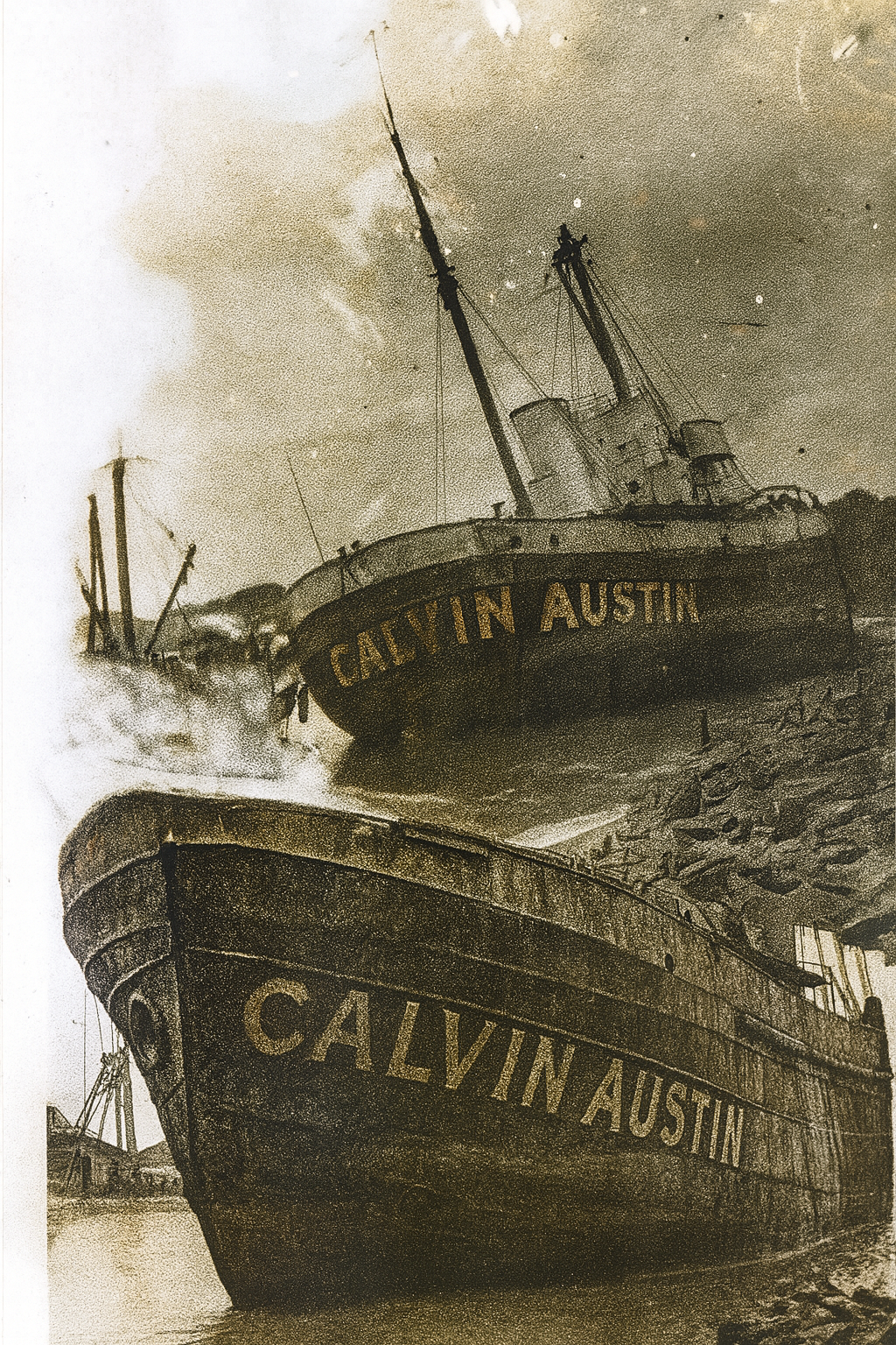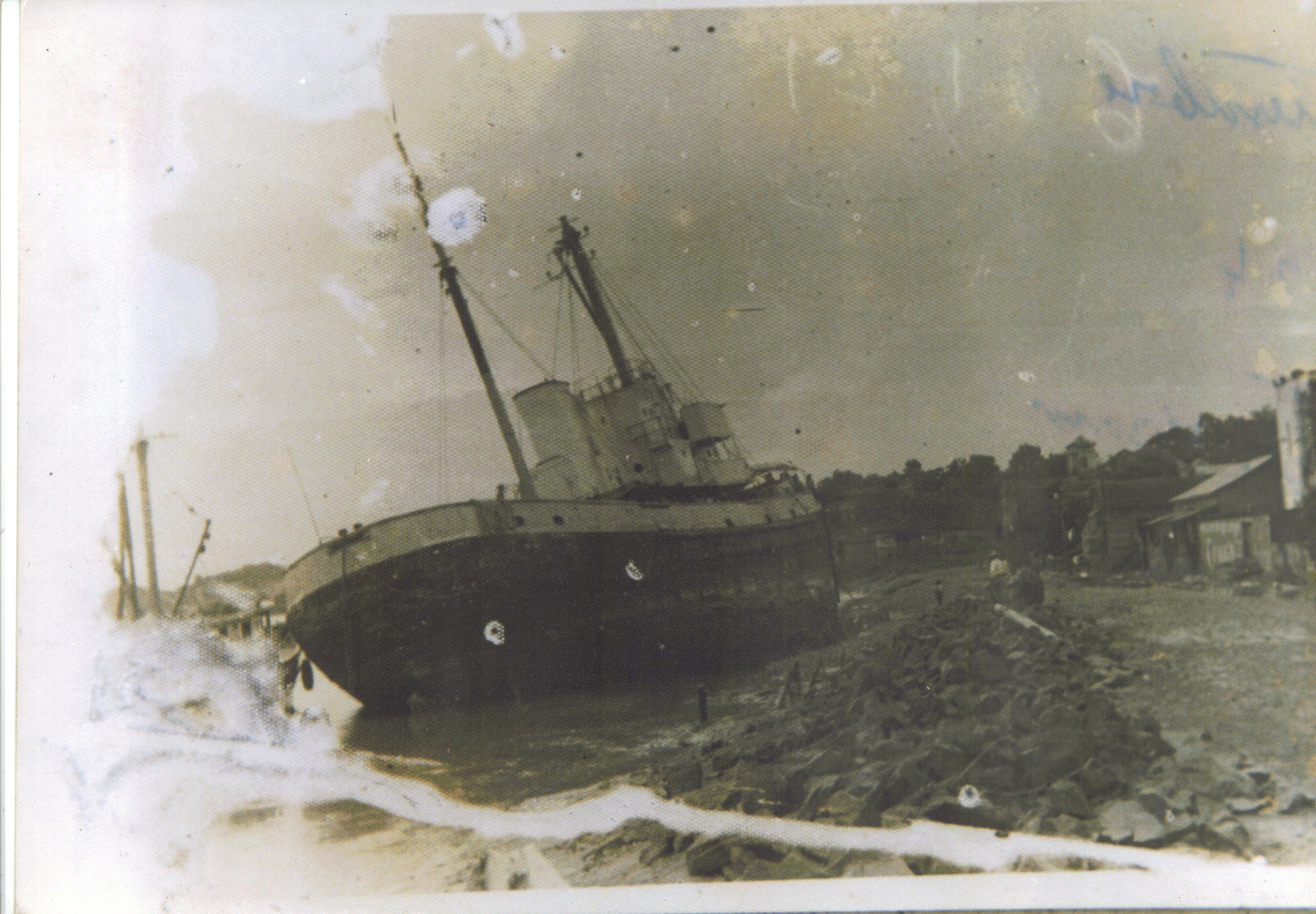 El gran barco refrigerante, orgullo de los Álvarez Soto, fue arrancado de su amarre y terminó embarrancado casi frente a la ciudad. La nave quedó inclinada, con el casco incrustado en la ribera, mientras la corriente seguía rugiendo.