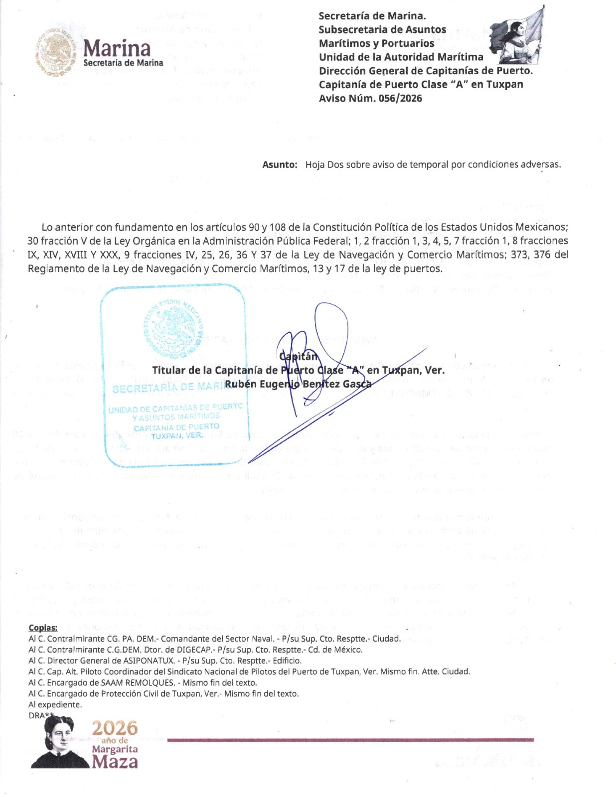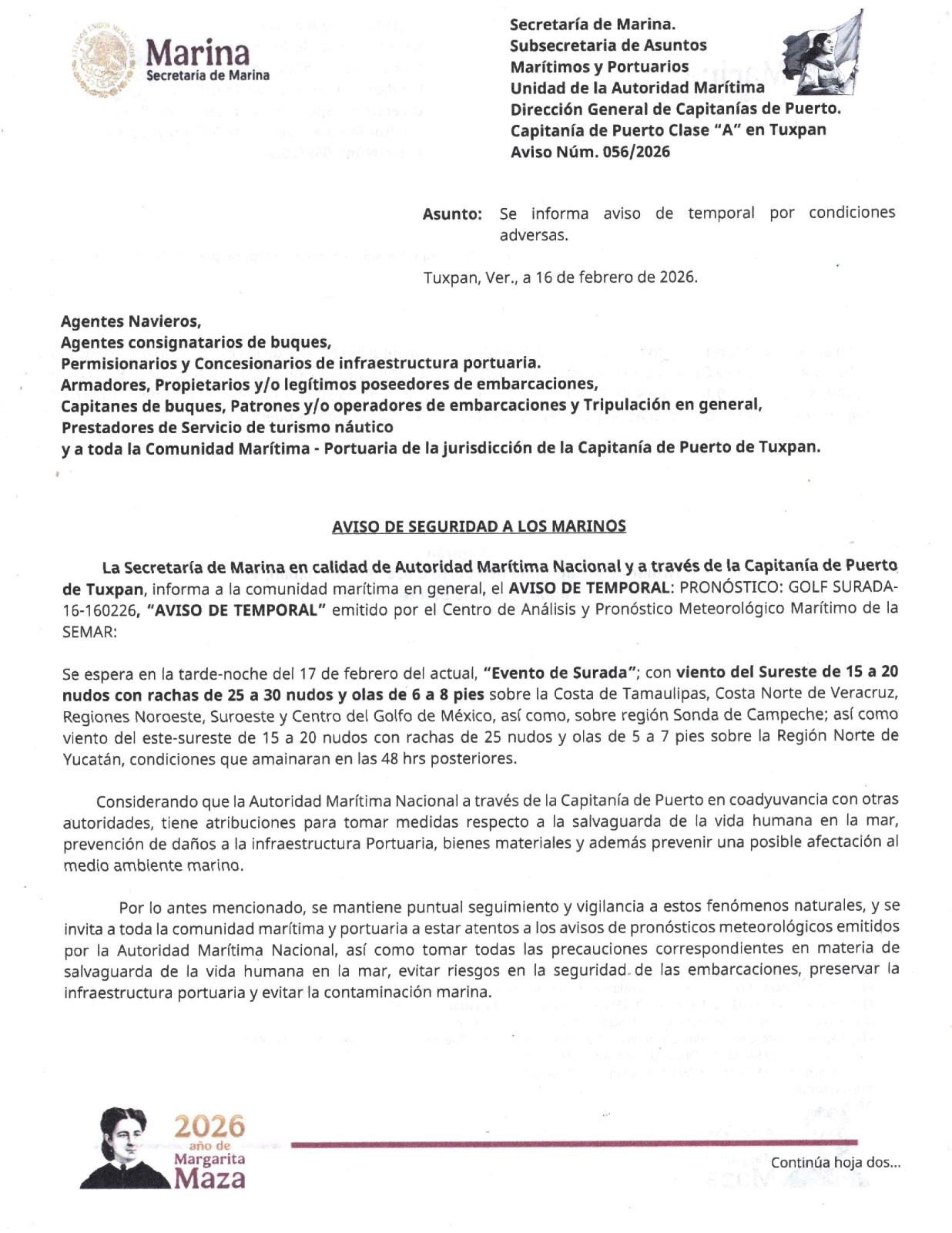 Tuxpan, Ver., 17 de febrero de 2026. — La Secretaría de Marina, a través de la Capitanía de Puerto Clase “A” en Tuxpan, emitió el Aviso de Temporal número 056/2026, debido a condiciones meteorológicas adversas que afectarán el Golfo de México y el Mar Caribe.