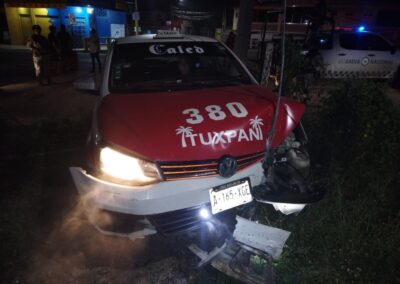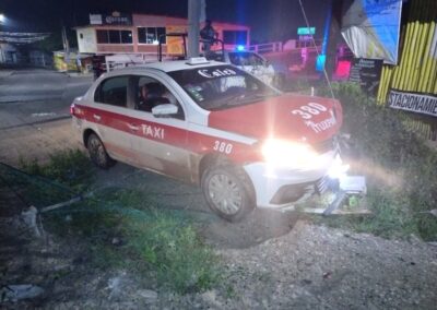Según los primeros reportes, tras el contacto entre ambas unidades y en un intento por evitar un impacto mayor, el conductor del taxi perdió el control del vehículo, lo que provocó que se proyectara hacia un costado de la vialidad y colisionara contra una cerca perimetral, cuyo propietario no ha sido identificado hasta el momento.