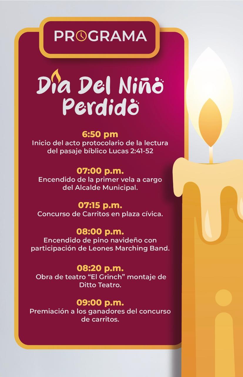 La celebración iniciará a las 18:50 horas en el Monumento al Niño Perdido con la lectura del pasaje bíblico Lucas 2:41-52 y a las 19:00 horas será encendida la primera vela, con lo que se dará inicio esta bella tradición.