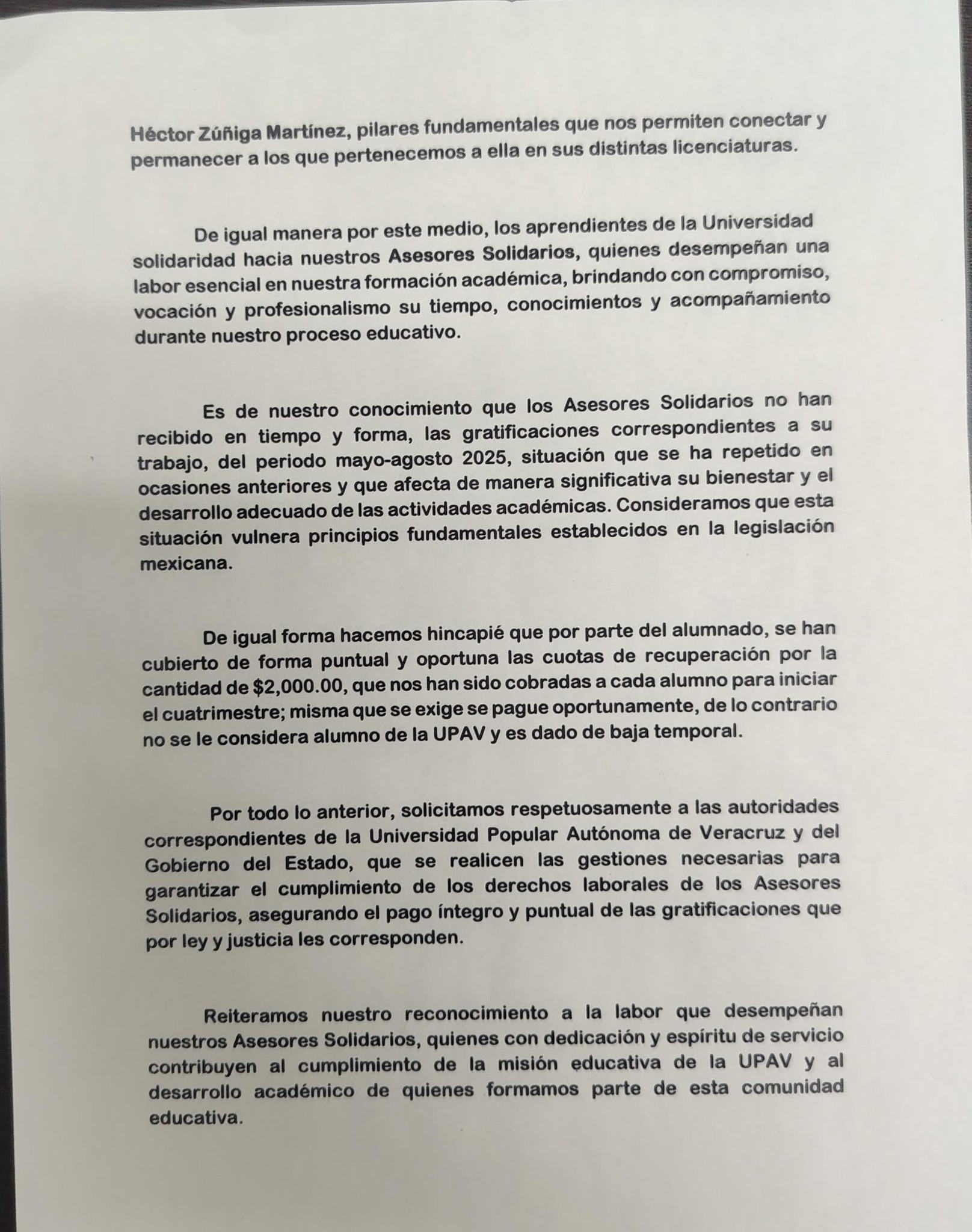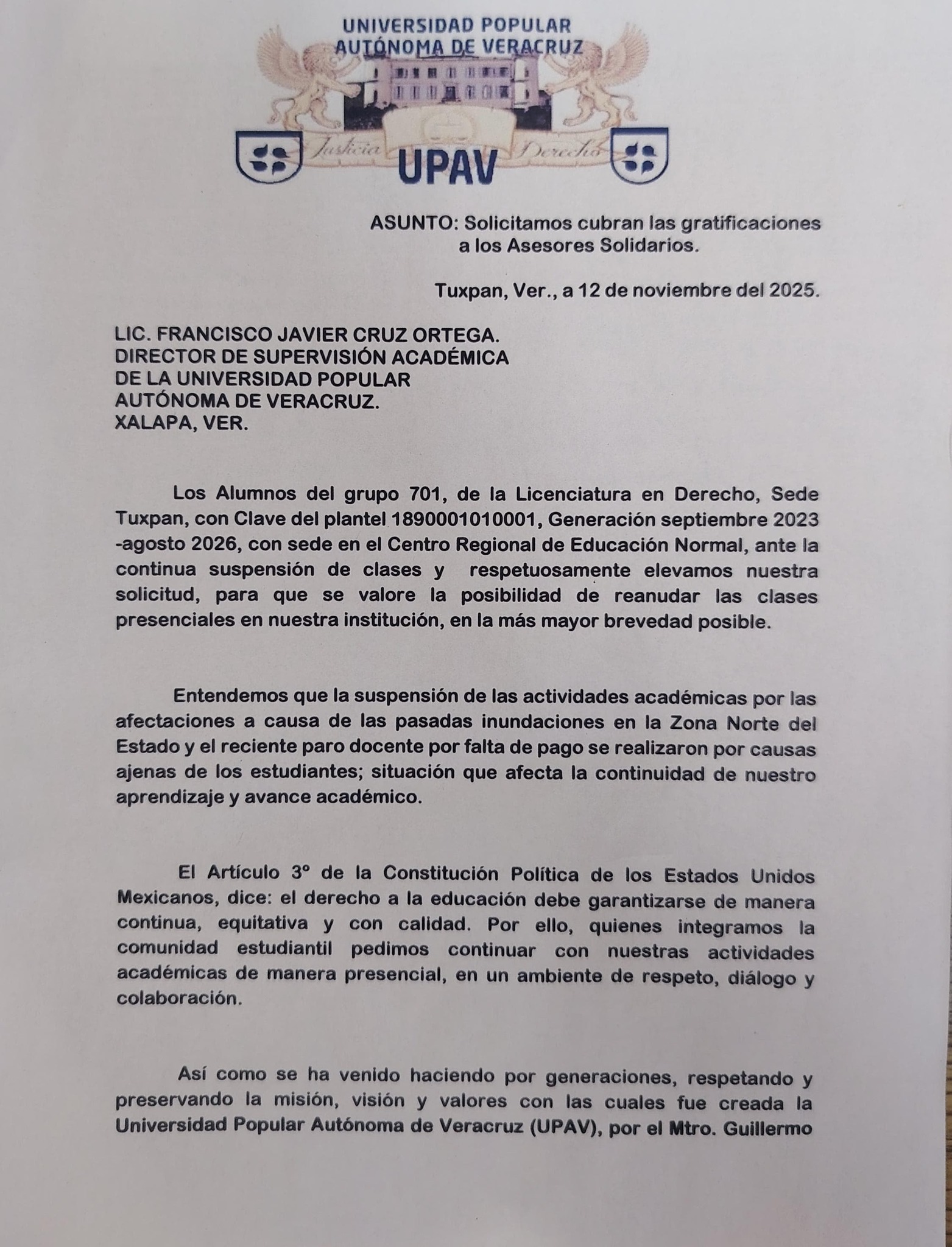 La UPAV está hecha un caos… y ya nadie puede esconderlo. Estudiantes de Derecho del plantel Tuxpan denunciaron que sus maestros llevan MÁS DE SEIS MESES sin recibir un solo peso, pese a que cada alumno paga más de $2,000 por cuatrimestre “sin retrasos, sin pretextos y sin descuentos”.
