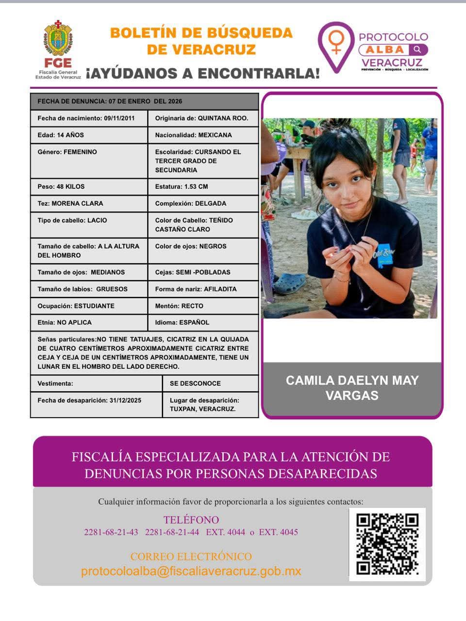 La Fiscalía General del Estado de Veracruz (FGE) mantiene activa la búsqueda de una adolescente de 14 años de edad, reportada como desaparecida en el municipio de Tuxpan, por lo que continúa vigente la ficha de localización y el Protocolo Alba, mecanismo especializado para la búsqueda inmediata de mujeres, niñas y adolescentes.