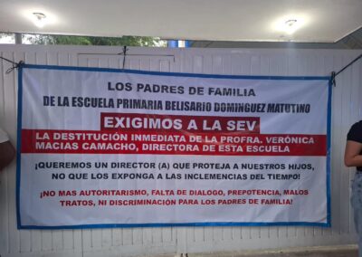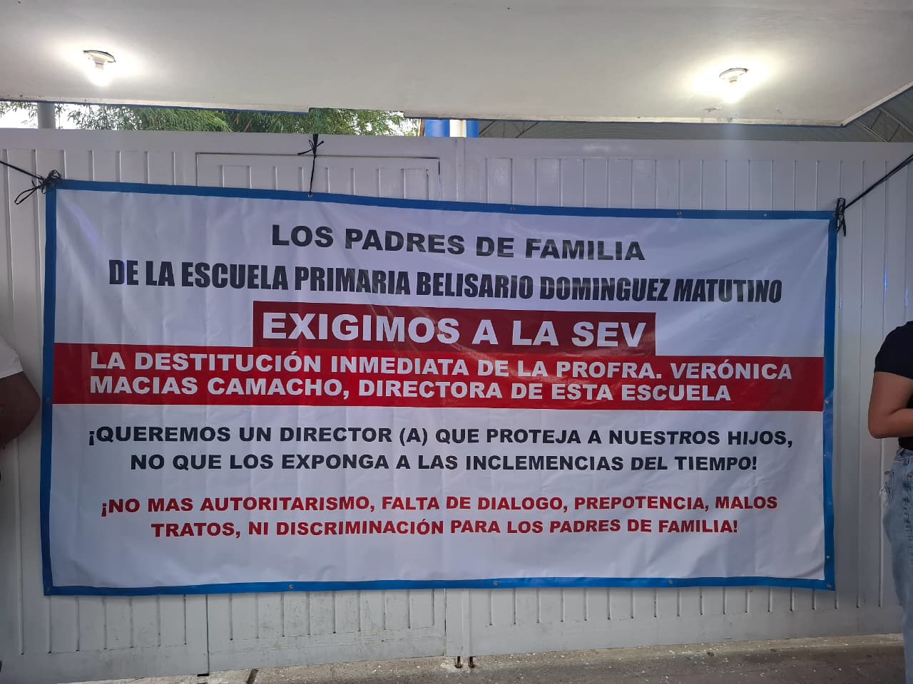 “¡No más autoritarismo ni discriminación para los padres de familia!”, se lee en la lona colocada frente al acceso.