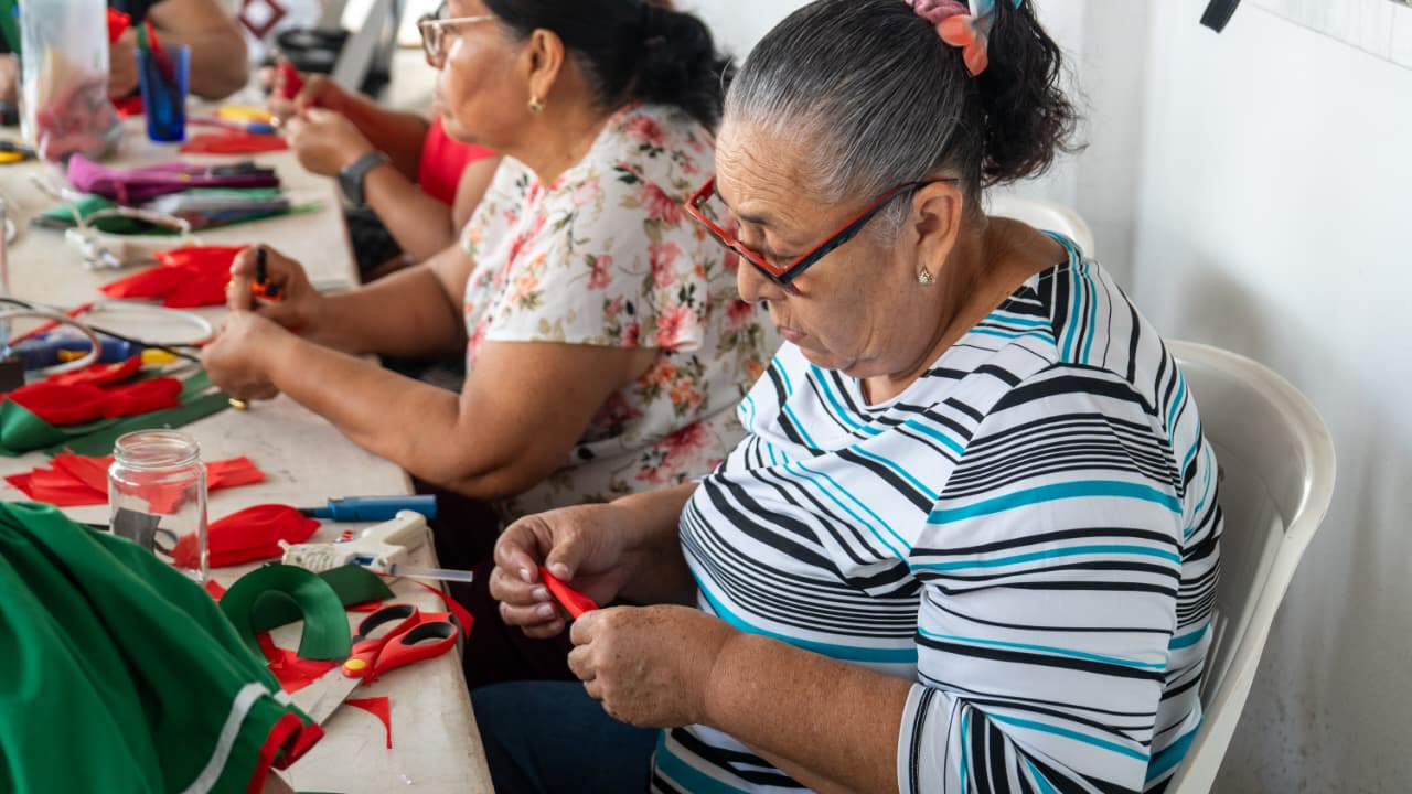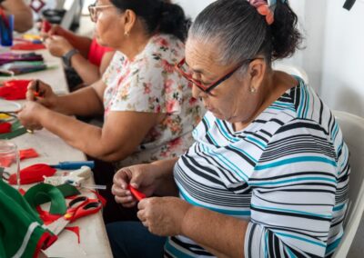 Por otra parte, en el taller para la elaboración de artículos con listón y cartón, que imparte la Fundación Sin Miedo a Trabajar Contigo, las participantes están creando decoraciones navideñas, mismas que después pondrán a la venta.