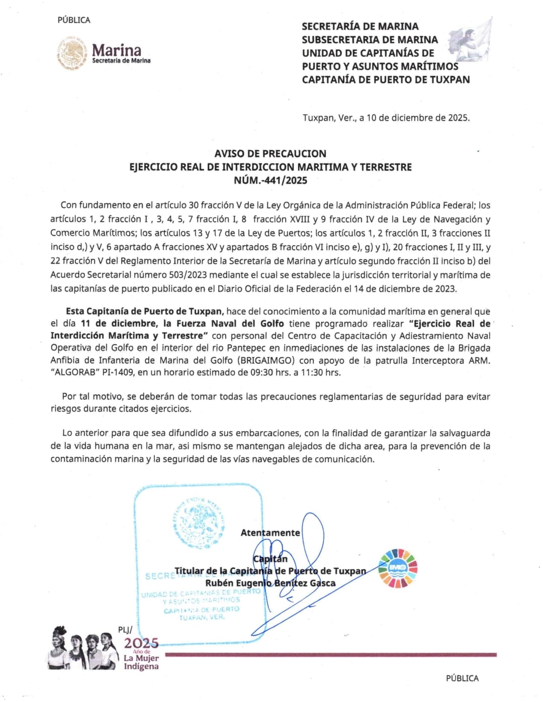 El comunicado, firmado por el capitán Rubén Eugenio Benítez Gasca, titular de la Capitanía de Puerto de Tuxpan, subraya que estas acciones tienen la finalidad de salvaguardar la vida humana en el mar, prevenir incidentes y reforzar la seguridad en las vías navegables.