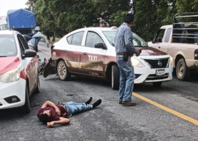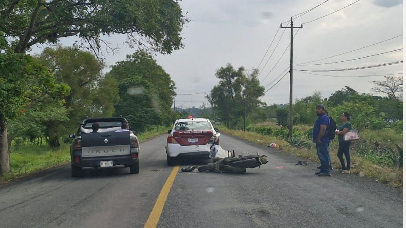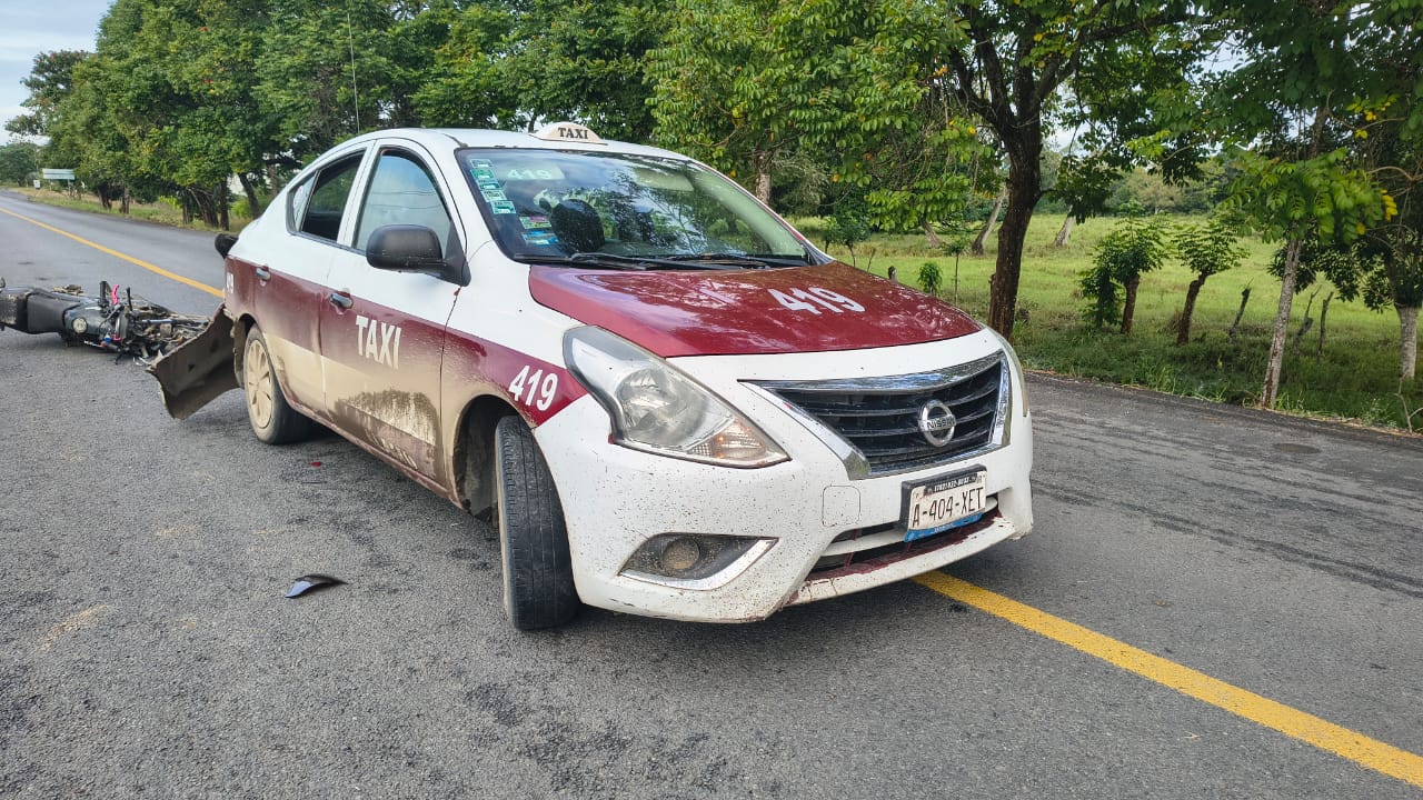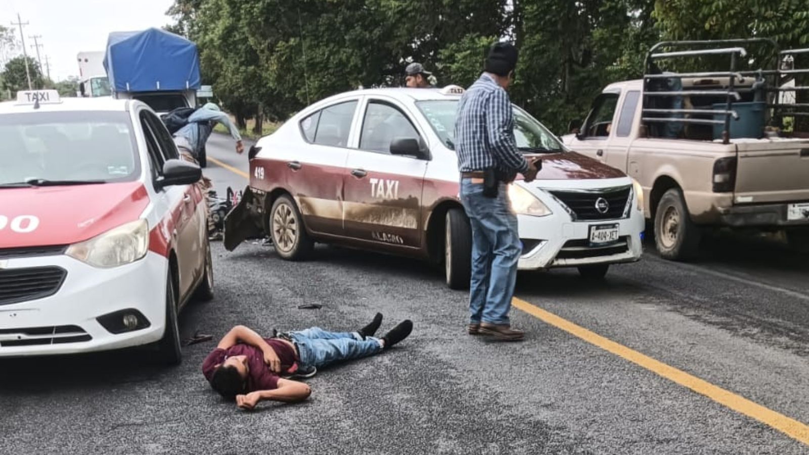 Un motociclista identificado como Lino “N.”, de 35 años, resultó seriamente lesionado esta mañana luego de impactarse por alcance contra un taxi del municipio de Álamo, mientras circulaba sobre el kilómetro 11 de la carretera Tuxpan–Tampico, a la altura de la comunidad de Buenos Aires.