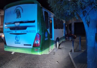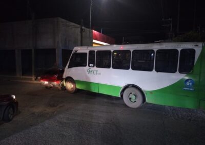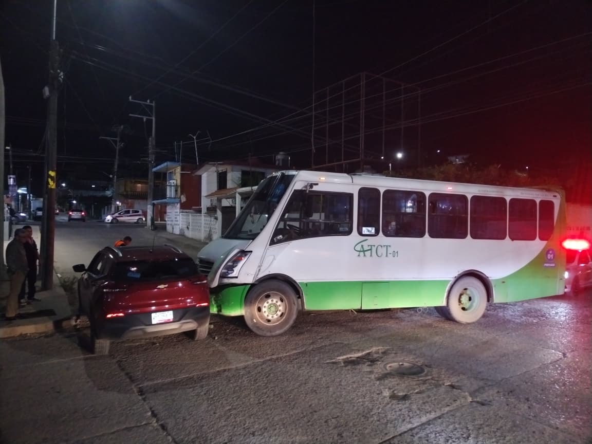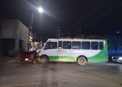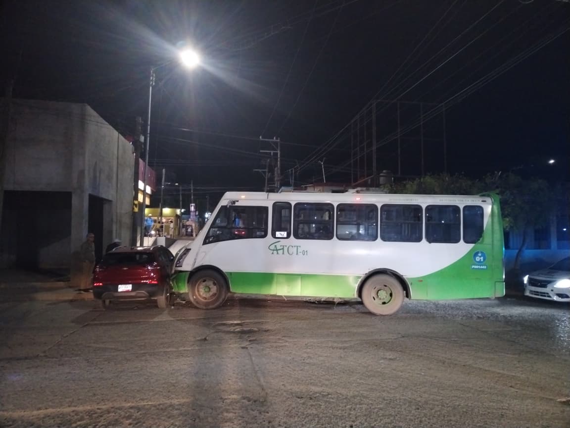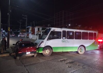 De acuerdo con el reporte policial, la conductora no respetó el señalamiento octagonal de alto, ocasionando que su vehículo fuera impactado en un costado por un autobús Mercedes Benz, color verde y blanco, modelo 2016, con placas A21464X y número económico 01, perteneciente al servicio de transporte público.