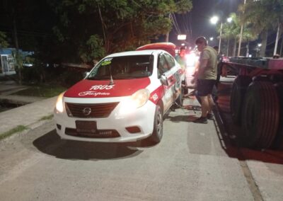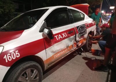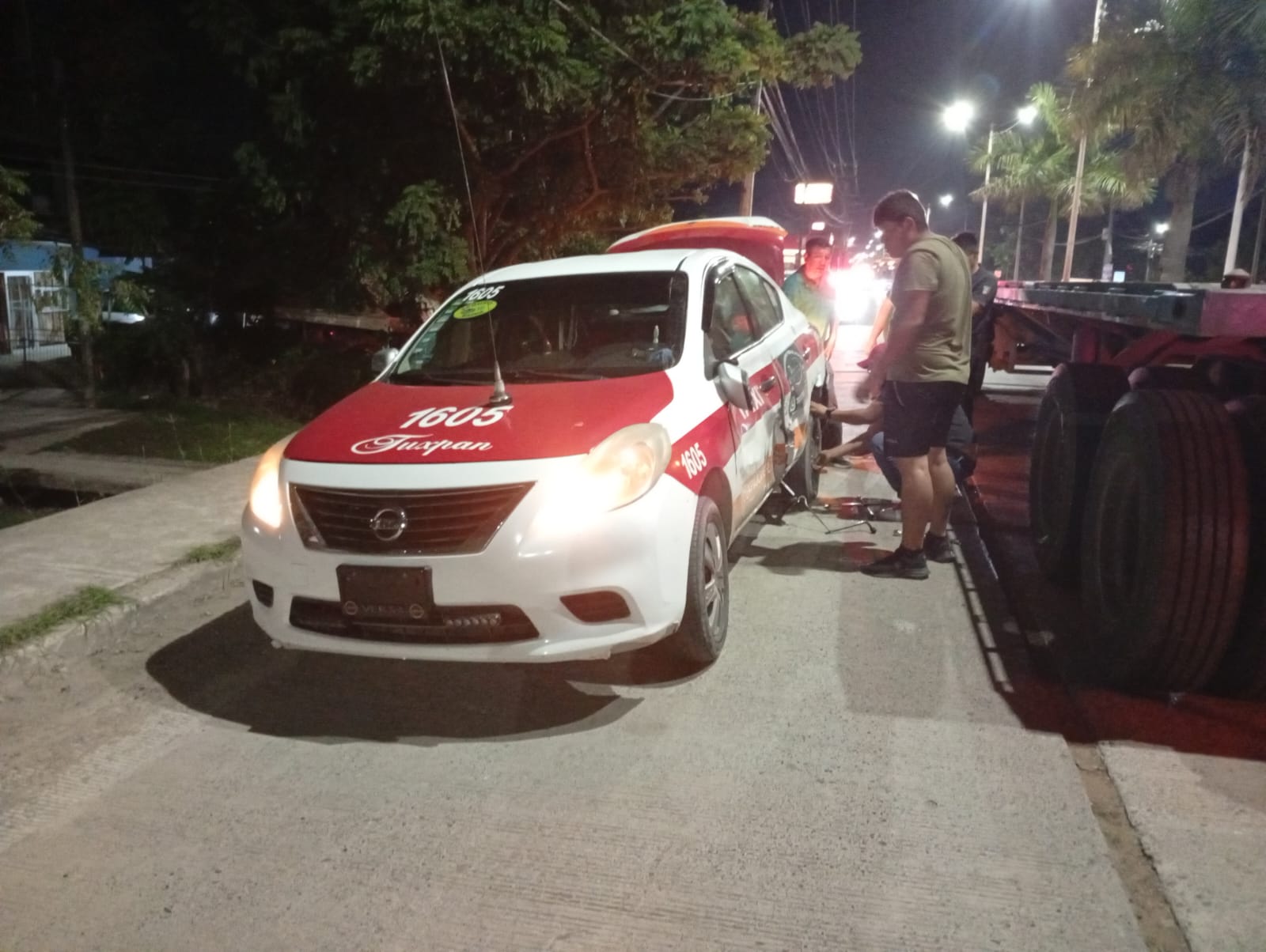 En ese momento, la pesada unidad impactó lateralmente al taxi Nissan Versa modelo 2014, en colores oficiales blanco con rojo, número económico 1605 y sin placas visibles, conducido por Yahir N., vecino de la congregación La Mata de Tampamachoco.