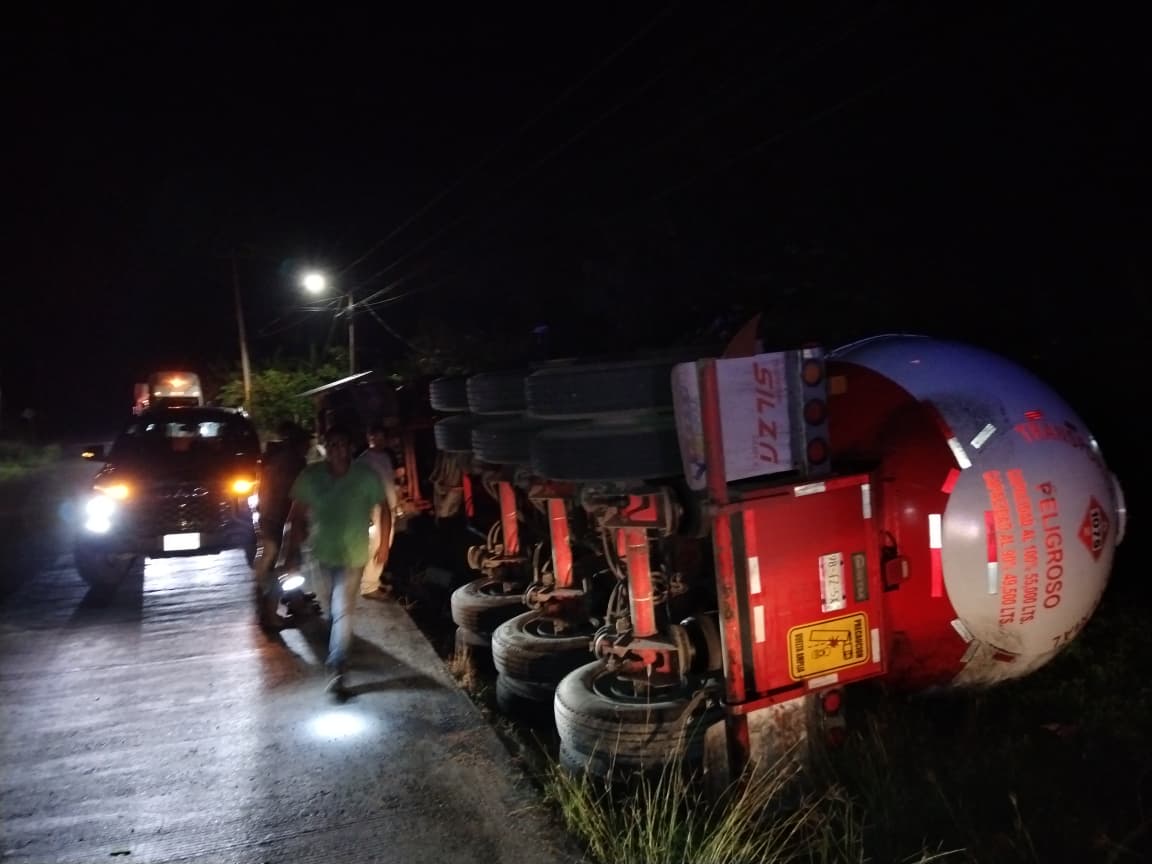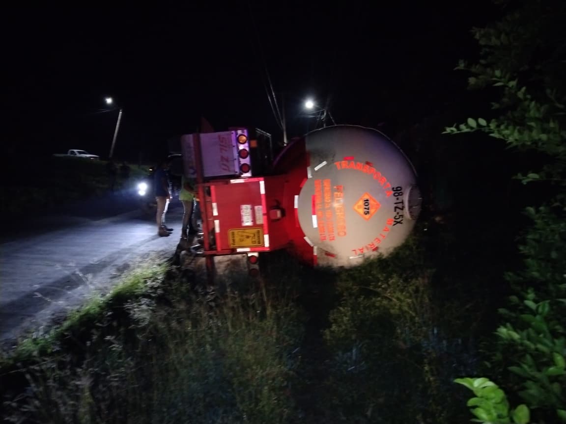 Una pipa de gas sufrió una aparatosa volcadura durante los primeros minutos de este jueves sobre la carretera Tuxpan–Cazones, a la altura de la localidad La Esperanza, sin que se reportaran personas lesionadas.
