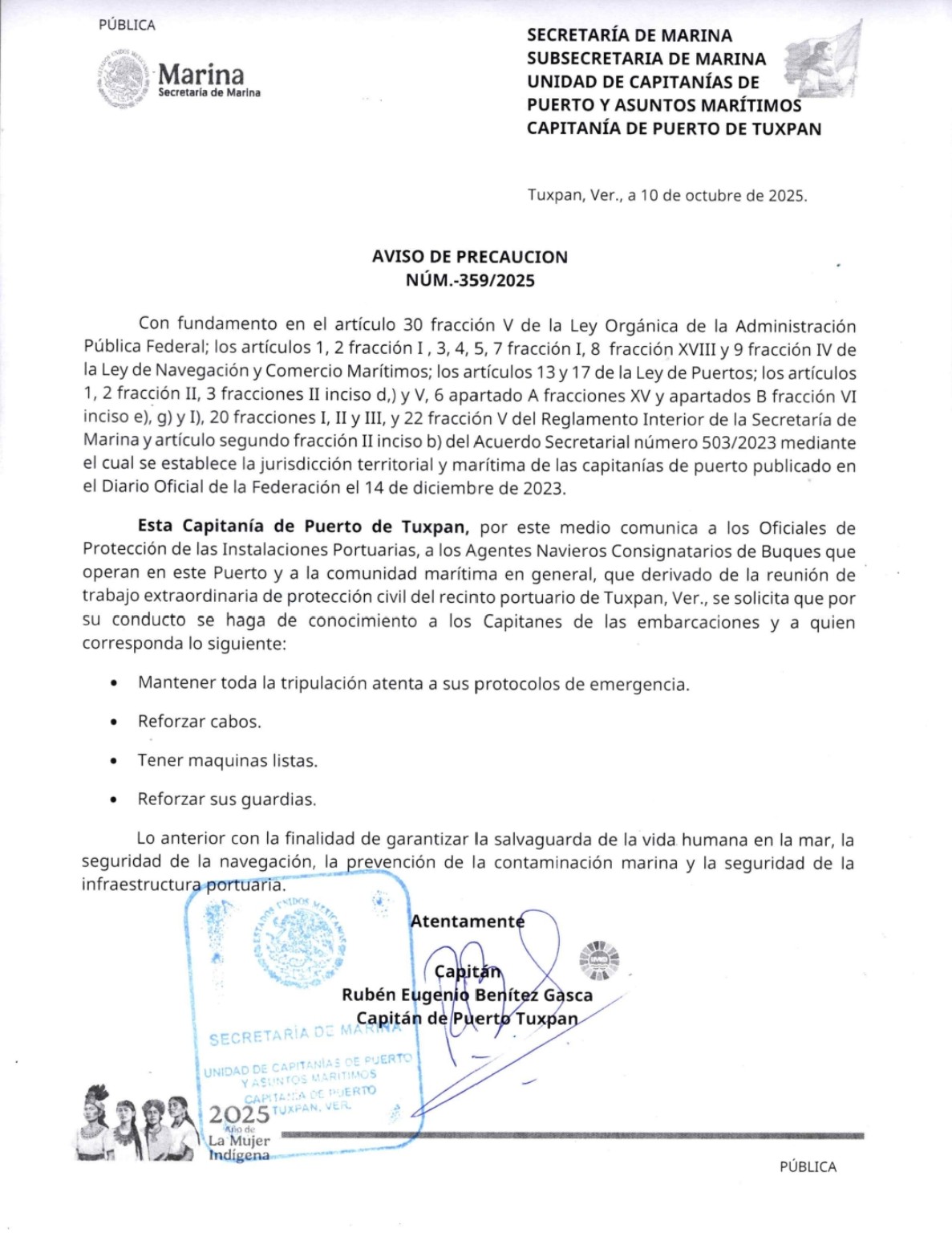 El documento, firmado por el Capitán Rubén Eugenio Benítez Gasca, instruye mantener a toda la tripulación en alerta máxima, reforzar cabos y guardias, y mantener máquinas listas ante posibles contingencias derivadas de las condiciones meteorológicas que afectan la región norte de Veracruz.