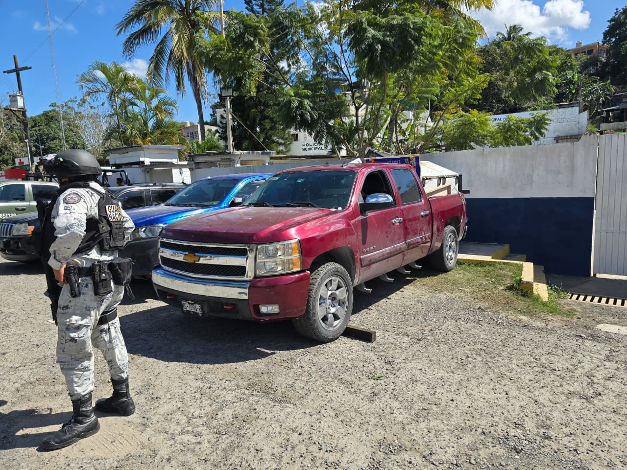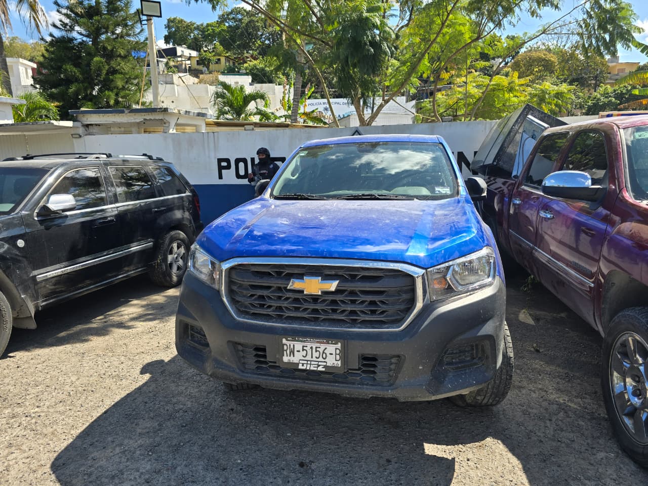 Las unidades aseguradas corresponden a una camioneta Jeep Liberty, color negro, con placas del Estado de México; una camioneta Chevrolet S10, color azul, con matrícula de la Ciudad de México; y una camioneta Chevrolet Sierra, color guinda, con placas del Estado de México.