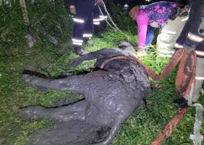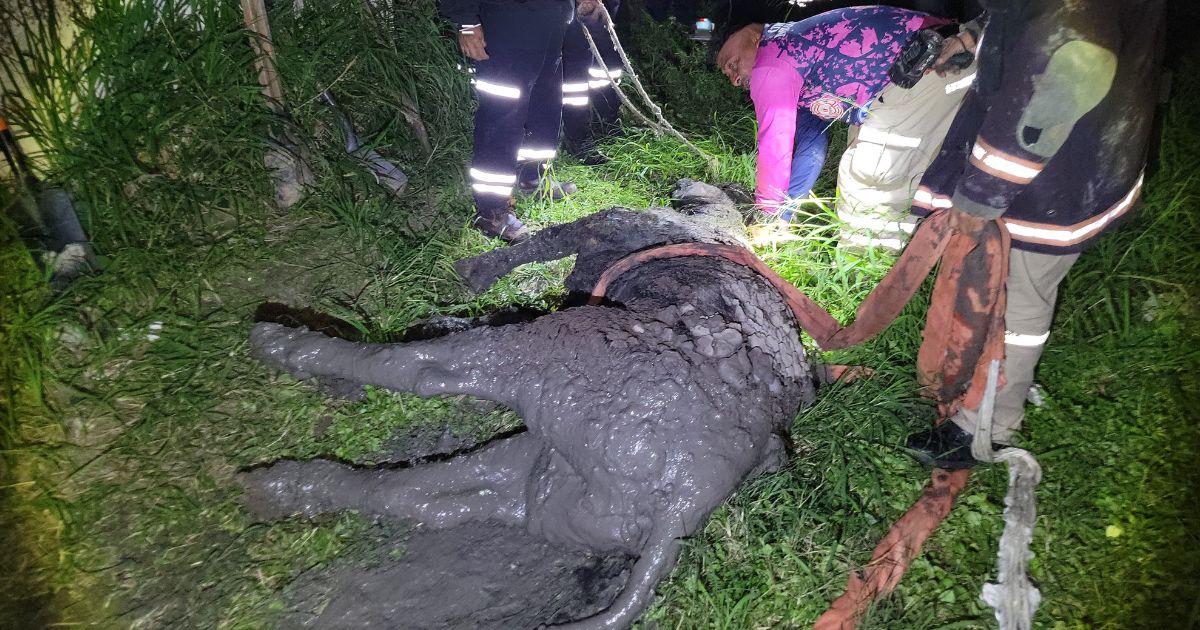 Una vez fuera, la vaca fue limpiada del lodo y revisada, sin que se le observaran marcas de fierro o señalamientos de propiedad, por lo que no fue posible identificar a su dueño.