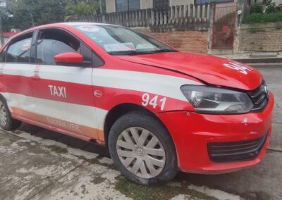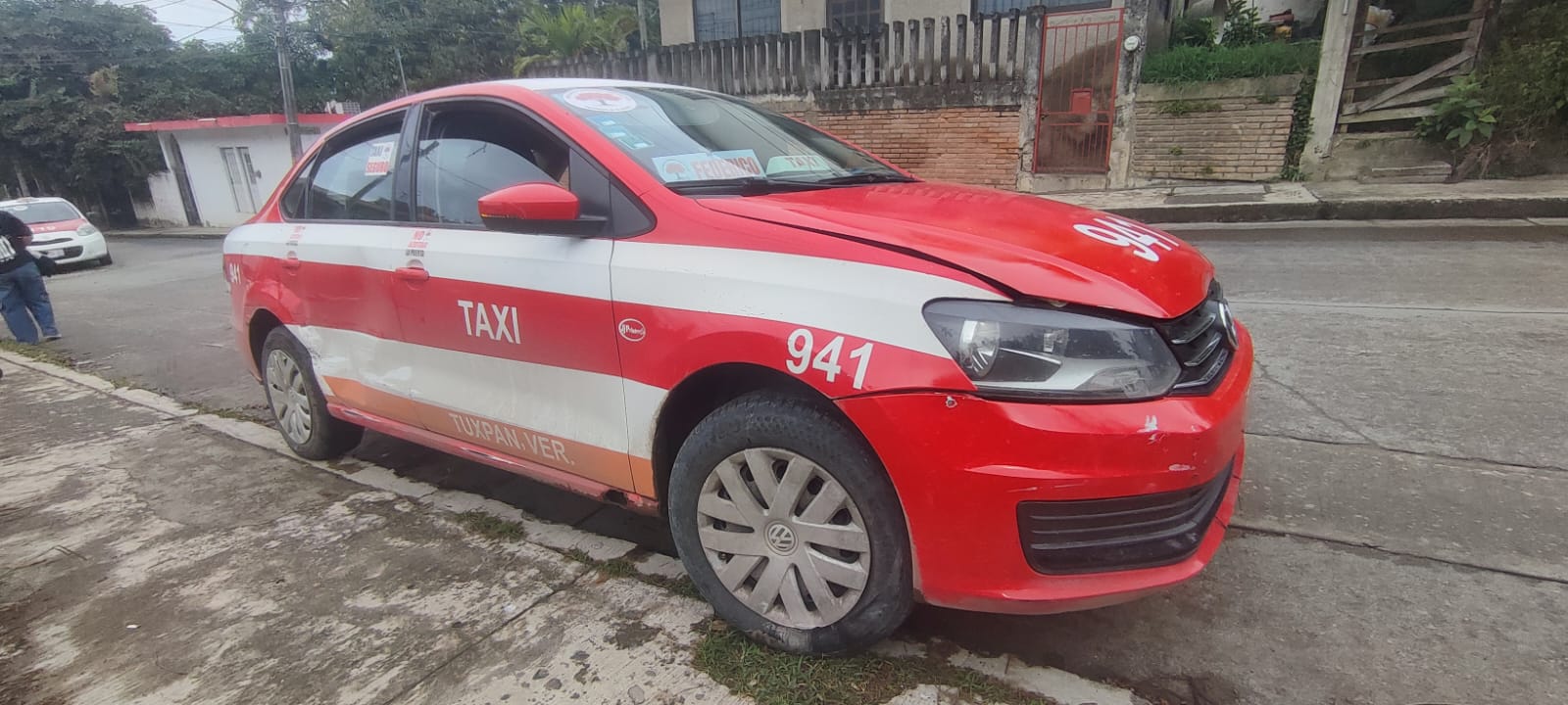 Esta maniobra provocó que fuera impactado por un taxi Volkswagen Vento, color blanco con rojo, modelo dos mil dieciocho, sin placas y con número económico novecientos cuarenta y uno, lo que derivó en un fuerte choque que dejó considerables daños materiales en ambas unidades.