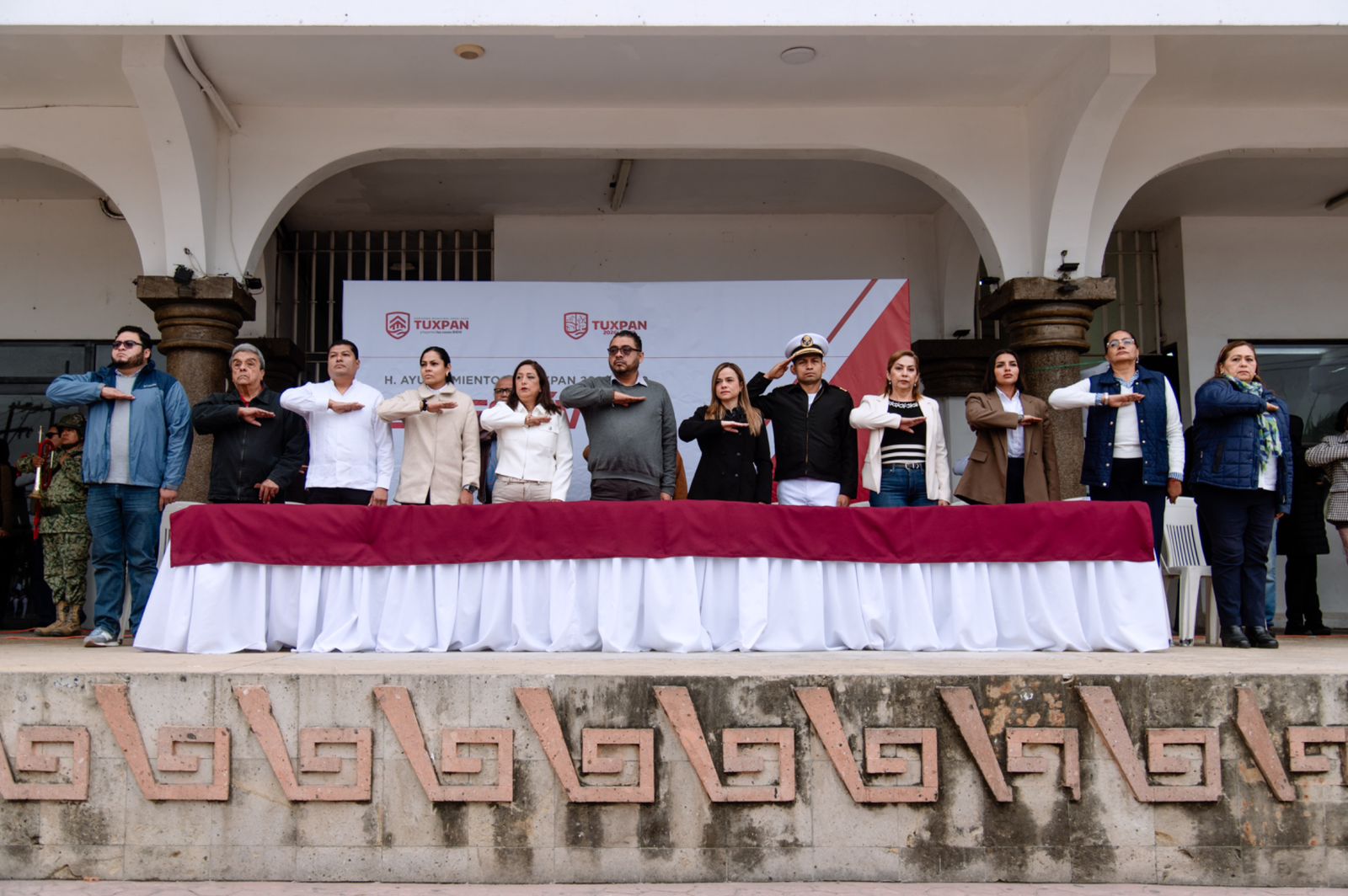 En el presídium estuvo en representación del presidente municipal, licenciado Daniel Cortina Martínez, el secretario técnico del Ayuntamiento, licenciado Eliseo Reyes Melchor; la presidenta del DIF Municipal, licenciada Marisol Martínez Barrios; en representación del vicealmirante cuerpo general, diplomado de Estado Mayor, comandante de la Fuerza Naval del Golfo, Benito Armando Galeana Abarca, asistió el capitán de corbeta Reyes Pérez Luna; así como integrantes del cuerpo edilicio, directores y coordinadores de la administración municipal.