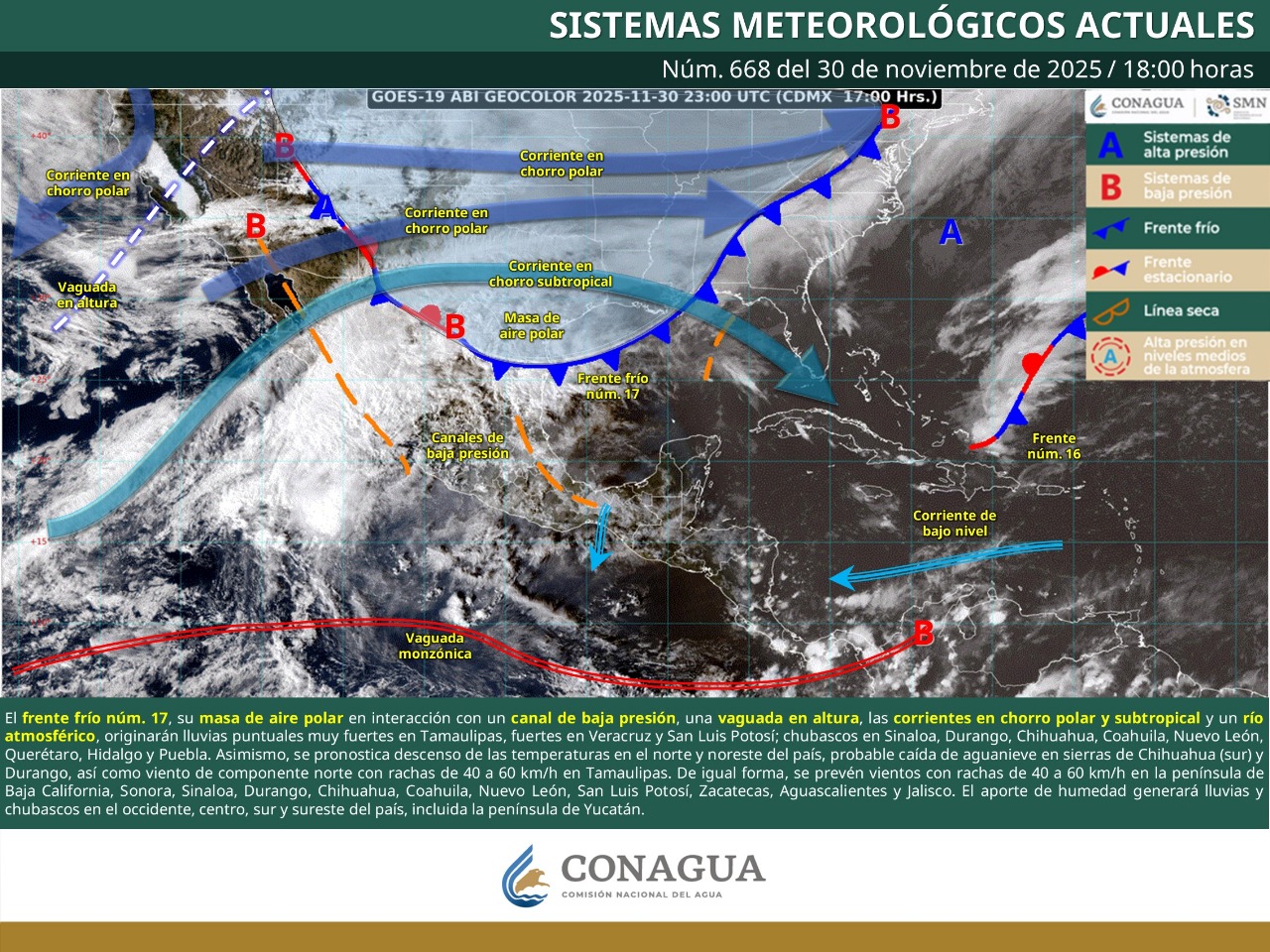 Tuxpan, Ver. 30/11/2025– Durante esta noche y madrugada del lunes, el Frente Frío número 17, impulsado por una masa de aire polar, habrá de provocar lluvias, evento de Norte y moderado descenso de temperatura.