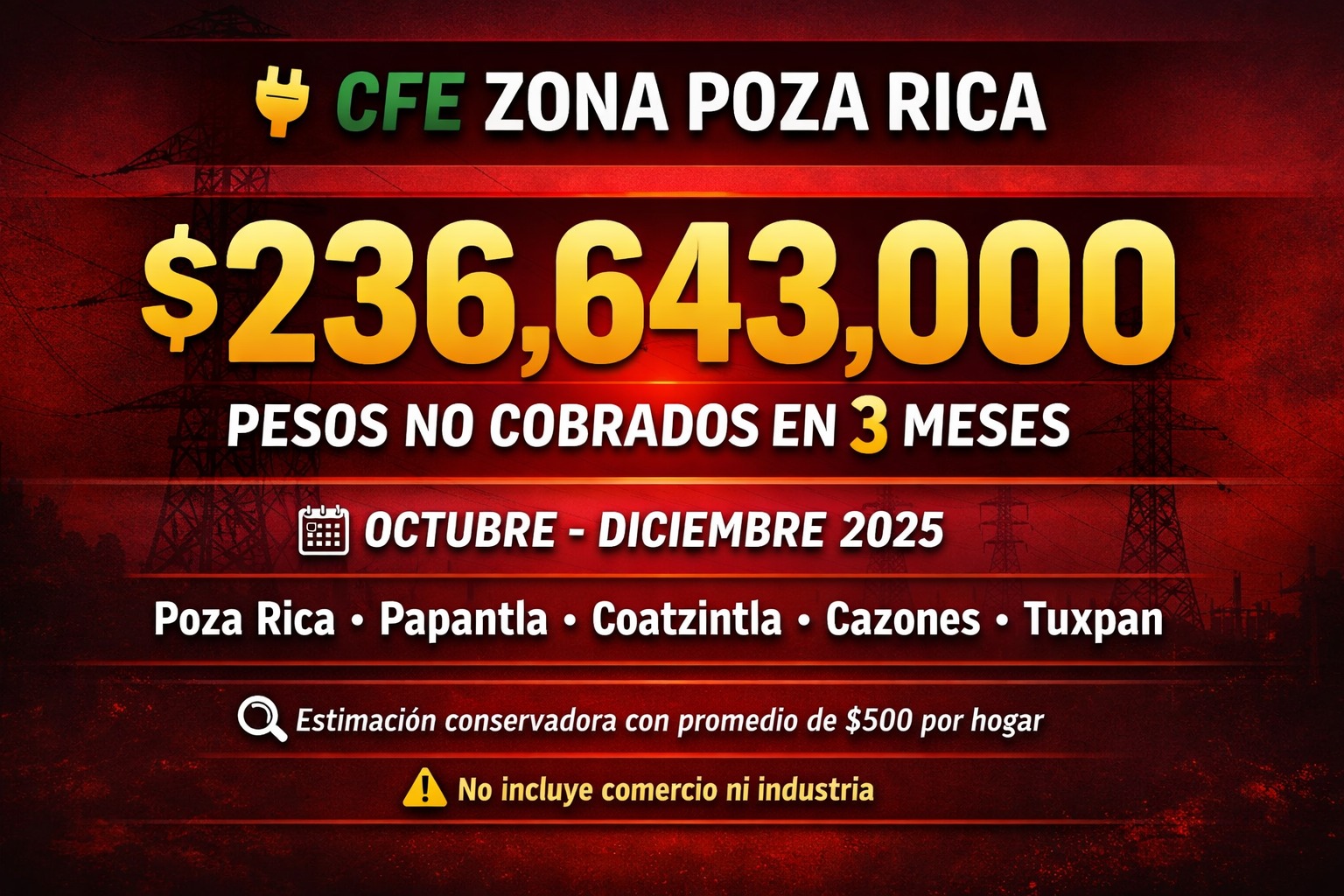 Poza Rica, Ver.– La Comisión Federal de Electricidad (CFE) enfrenta un serio problema de facturación en la Zona Poza Rica, luego de que desde el mes de octubre del dos mil veinticinco dejara de emitir recibos de energía eléctrica a miles de usuarios, presuntamente a causa de una “actualización de servidores” que habría provocado la pérdida o inaccesibilidad del historial de consumo.