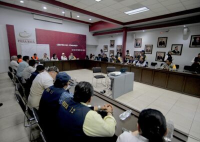 Poza Rica, Ver., viernes 10 de octubre de 2025.– La gobernadora Rocío Nahle García y la coordinadora nacional de Protección Civil, Laura Velázquez Alzúa, encabezaron la reunión de evaluación en el Puesto de Comando instalado en Poza Rica, con el objetivo de fortalecer la respuesta interinstitucional ante las afectaciones provocadas por las lluvias.