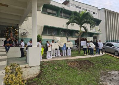 La protesta se realizó a las afueras del hospital y en áreas administrativas, sin bloqueo de accesos ni afectación a la atención médica. Los manifestantes colocaron cartulinas con consignas como “No a las tarjetas limitadas”, “Sí al bono de libre disposición” y “Respeto a la base trabajadora”, dejando claro que la movilización tiene un carácter laboral y económico.