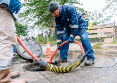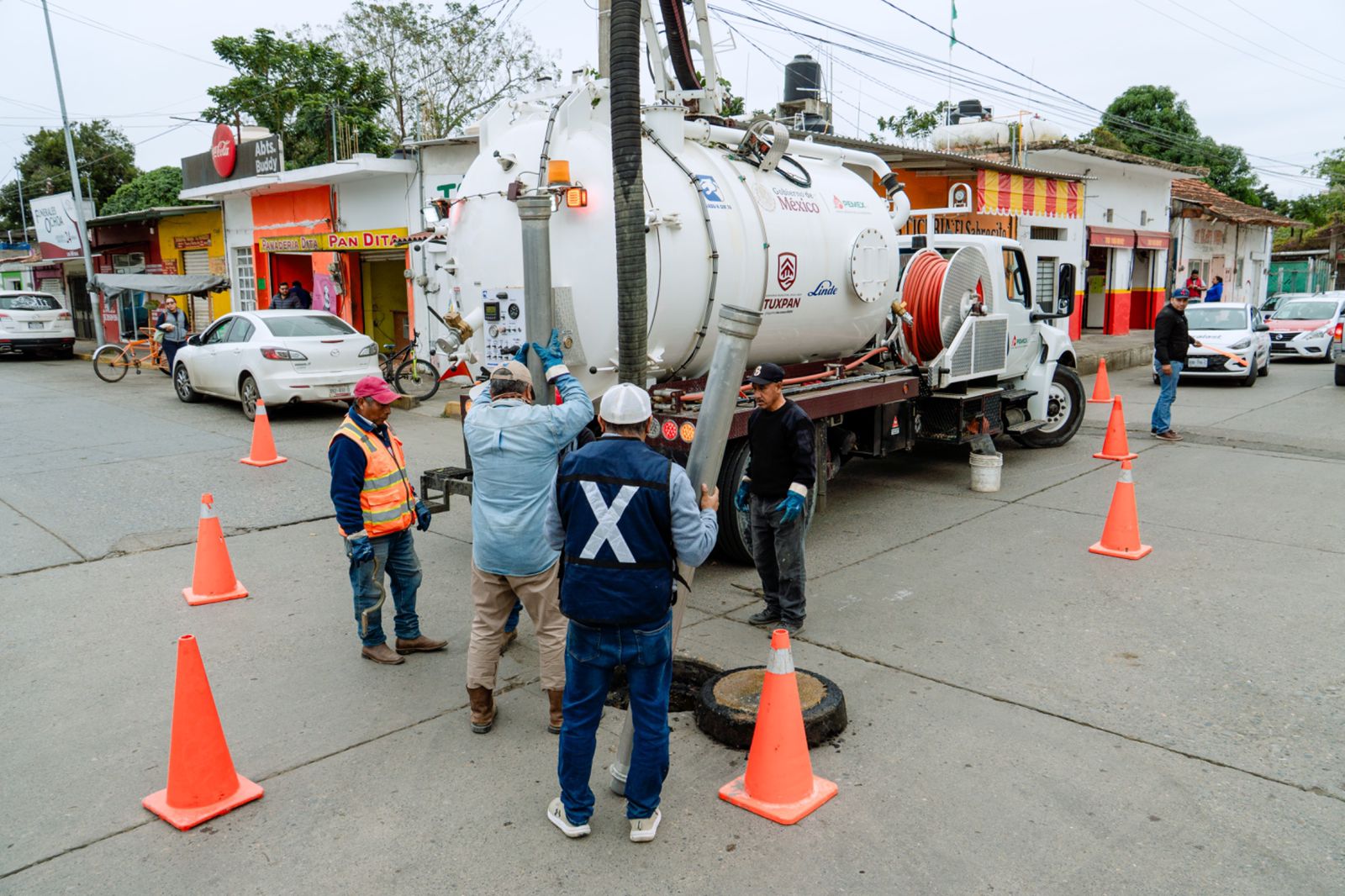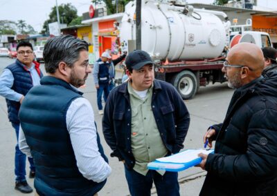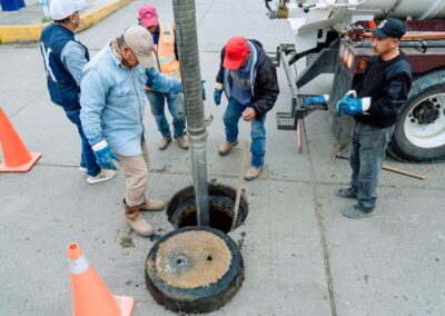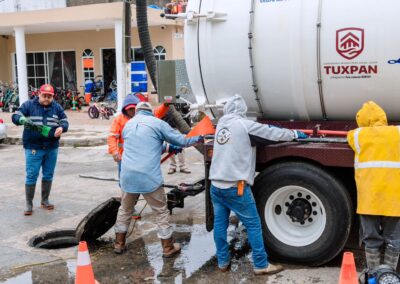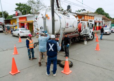 De manera paralela, se lleva a cabo el desazolve de 17 pozos de visita en diversas calles de Santiago de la Peña, lo que representa la atención de aproximadamente mil 300 metros lineales de drenaje. Estas acciones permiten poner fin a los derrames de aguas residuales en la vía pública, además de la reparación de dos fugas de agua, logrando que el sistema de drenaje opere de manera adecuada y eficiente, en beneficio directo de las y los habitantes de esta zona.