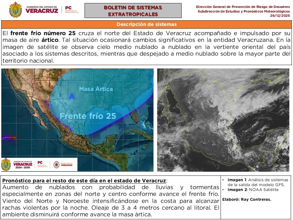 Tuxpan, Veracruz a 29 de diciembre de 2025 |Esta tarde se espera la llegada del Frente Frío 25, que trae “Norte” violento, además de lluvias fuertes y marcado descenso de temperatura.