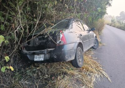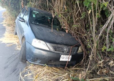 El vehículo involucrado es un Nissan Aprio, color gris, con placas YGH-884-A del estado de Veracruz. De acuerdo con el parte informativo, el conductor —cuyo nombre no fue revelado— se desplazaba con dirección a Tuxpan cuando, por causas aún no precisadas, perdió el control del volante, provocando que la unidad saliera de la cinta asfáltica y quedara detenida entre la maleza a un costado de la vía.
