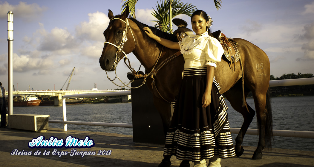 Como es tradición, la Reina de la Expo Tuxpan, Arlette, posa para las cámaras de Antonio Arango. Un profundo agradecimiento al Rancho EL DIAMANTE por facilitarnos a La Malquerida y María. Esas hermosas yeguas le dieron un estilo muy acorde a las fiestas patronales...